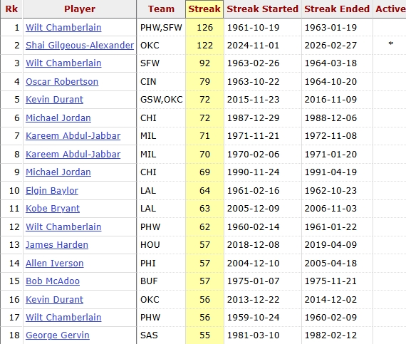 同时,亚历山大连续59个客场砍下至少20分,打破了张伯伦在1962-63赛季保持的NBA历史客场连续20+次数纪录。