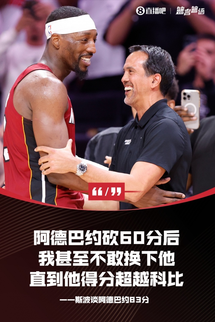 赛后,热火主教练斯波点评阿德巴约表现时说道:“这是一个超现实的夜晚,我们在这座球馆里见证过太多奇迹,今晚这就这么发生了,我们很幸运,能够见证这一刻。他第一节的表现就像一头怪兽,半场40+,半场休息的时候我们还是在说就正常打我们的比赛,但球就是在不断的找到他。一旦他得到50分,我们就认为他能得60分,一旦他得到60分,我们就说得70分吧,我从那时候起就没想过,甚至不敢换下他,我想让他享受生涯之夜,让他享受球迷的欢呼,我不知道他的得分什么时候会停止,但他一直在得分,最终我在他得分超越科比后才把他换下来。”