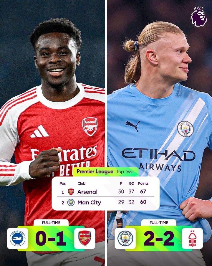 03月05日讯 英超第29轮,志在争冠的曼城在保级队身上栽跟头,本轮被诺丁汉森林逼平送出关键积分。另一边,阿森纳虽踢得惊险,但还是成功战胜布莱顿,成功收下三分。